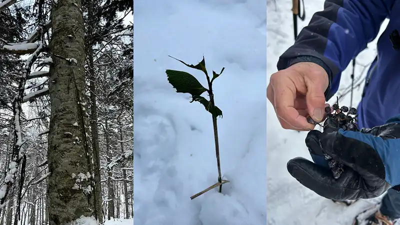 放眼望去盡是白雪、雜草與樹林,但在導遊的解說下才知道,雪上大小不一、延綿不斷的小坑洞,是各種小動物行經過的足跡。根據昨晚曾經下雪的情報判斷,小動物們應該經過不久。從雪中竄出的乾枯雜草,仔細一看也並不是因為枯萎而顯得破爛,而是有被鹿啃食過的痕跡;高掛在樹上的冰凍山葡萄,也是鹿和鳥類在寒冬中的珍貴食物。雖然健行時周遭十分靜謐,卻能從各種小細節,感受到動物們生活的痕跡。