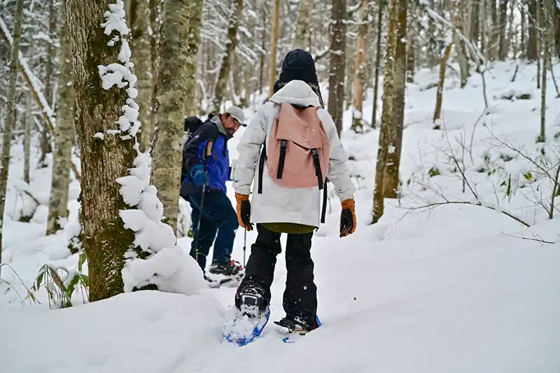 這次趁著日本過年期間造訪TOMAMU,預約了「雪山健行&森林咖啡」(スノーシューハイキング&森カフェ)體驗。由於要走進地面鬆軟的雪山,為了避免陷進雪中寸步難行,需要穿著底部面積寬大的雪鞋。雖然是第一次穿著但很快就能上手,順利走進有坡度的雪地。雖說是「雪山健行」,但其實只是一座小山,沿路聽著解說漫步,大約一個小時就能抵達山頂了。