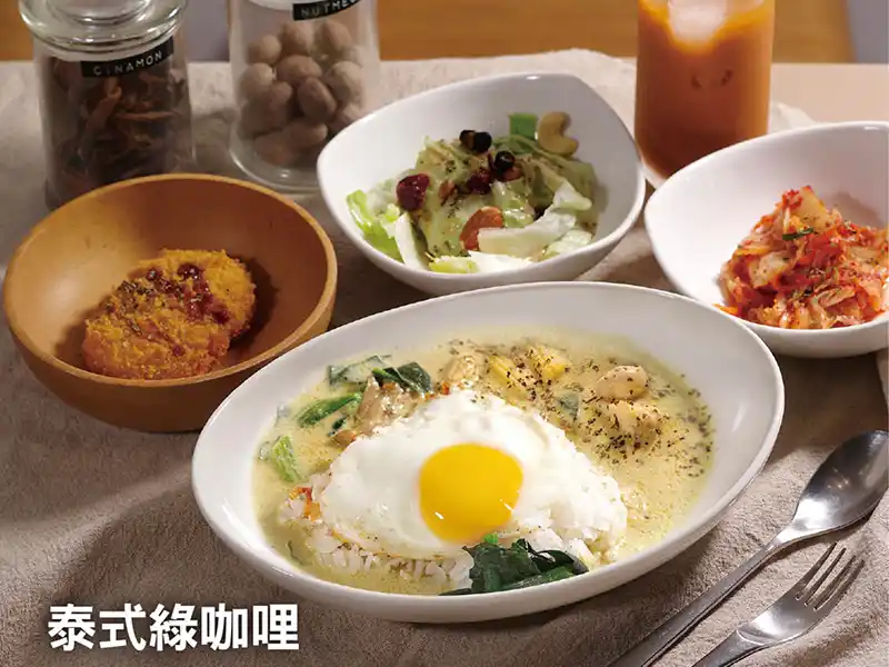 香料咖哩結合了日式與印度,以十幾種香料炒製而成,是在日本盛行已久的口味。為了開店,樋口さん當初在日本走訪了各式各樣的咖哩店,經過反覆研究與嘗試,最終製作成全新風味的香料咖哩。他強調:「我們秉持使用天然香辛料,沒有添加任何的化學調味料,並且都是每天現做,讓大家享用好吃又健康的咖哩。」肉醬咖哩使用豬絞肉為基底,醬汁濃郁厚實,相當受到小朋友的喜愛;而泰式綠咖哩則附有雞肉、玉米筍等配料,微辣且帶有淡淡的椰奶香。由於三款咖哩中只有綠咖哩是辣的,店內特別提供了香料、辣椒等調味料,讓喜歡吃辣的客人可以依照喜好自行添加。