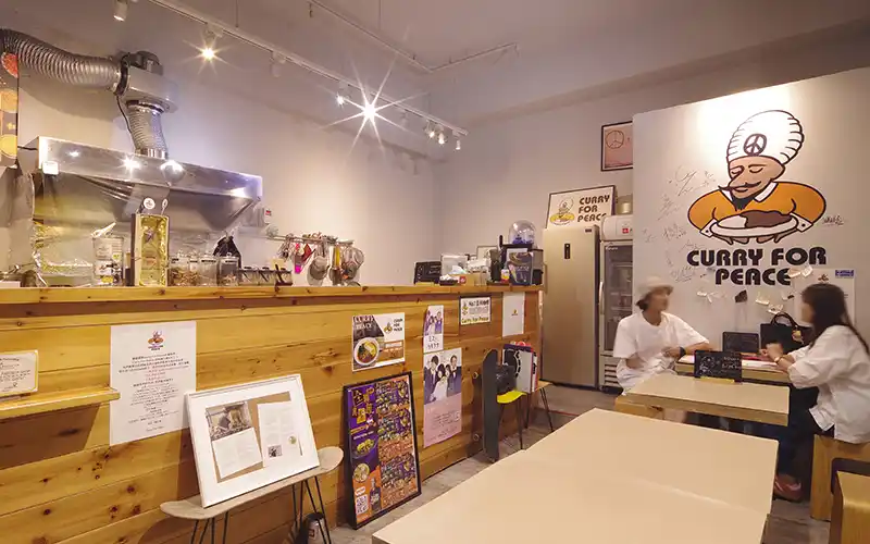 一踏入店裡,首先映入眼簾的,是牆面上戴著頭巾、端著咖哩的男子圖樣,搭配上「CURRY FOR PEACE」的字樣,便成為整間店最醒目、亮眼的標誌。這個代表店鋪的圖案是由日本知名設計師繪製,也曾推出過T恤、別針等相關周邊商品。