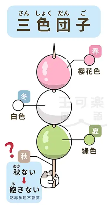 原來這是日本人在「語呂合わせ(ごろあわせ)」上的創意,我們知道「秋」的日文講「あき」,而「沒有」的日文則是「ない」,把「あき」跟「ない」結合在一起時會是「あきない」,什麼是「あきない」呢,「不會膩」就是「飽(あ)きない」,換句話說三色團子的三種顏色中,少了象徵秋天的顏色,用來表示「吃再多,也吃不膩」,不得不說,日本人的「語呂合わせ」真的非常有趣。