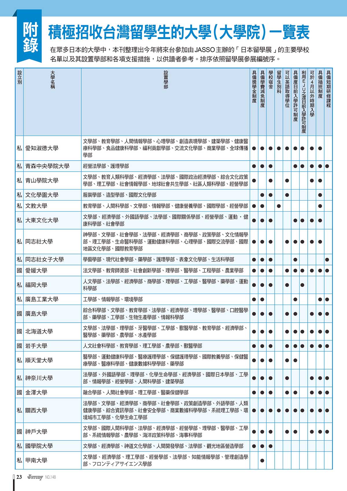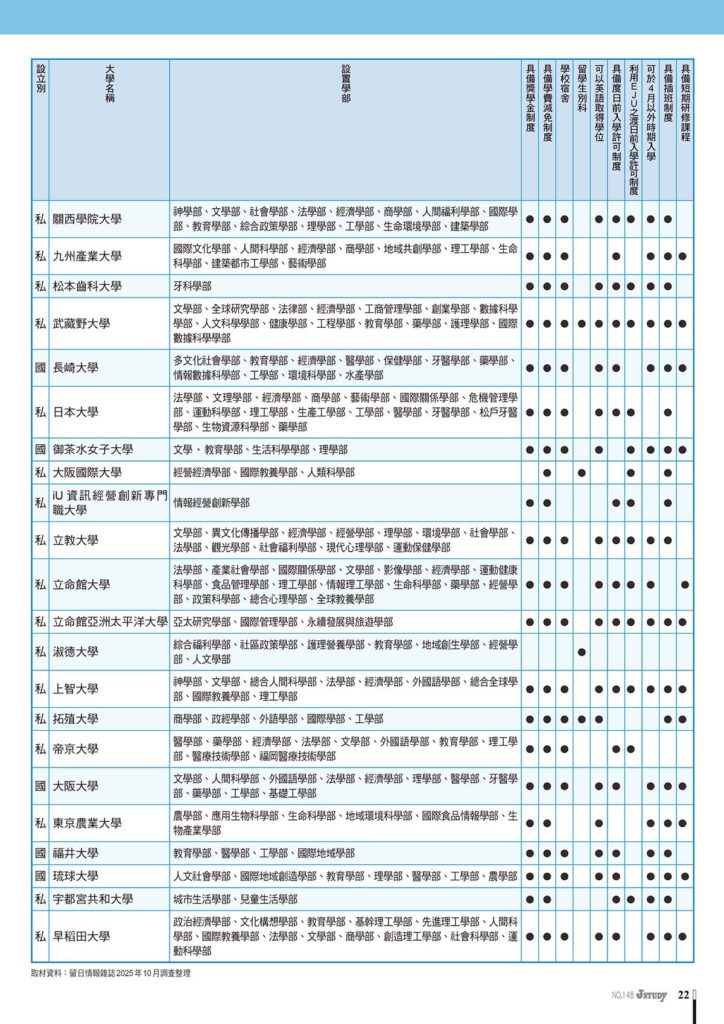 在眾多日本的大學中,本刊整理出2025年來台參加由JASSO主辦的「日本留學展」的主要學校名單以及其設置學部和各項支援措施,以供讀者參考。排序依照留學展參展編號序。