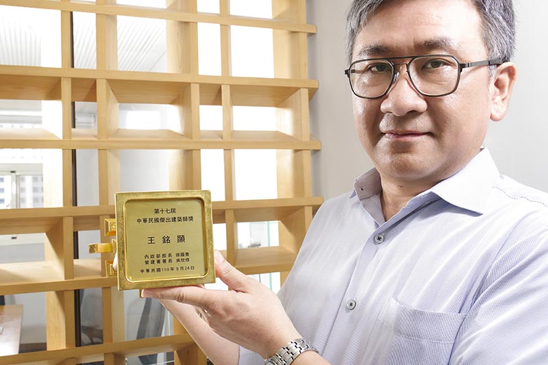在日本學術與實務中所習得的種種,帶給王銘顯許多啟發,並逐一體現在事務所的各項設計當中。「留日之前,我對日本雖然還沒有太多的了解,但是隱約能夠從建築師的作品中感受到其背後蘊含的學問與涵養。這是因為建築師在著手設計之前,對環境、空間有著深刻的觀察與理解,才能夠將這些思維帶入作品之中。在進一步深入研究過後,我發現日本文化的底蘊深厚,包括傳統日式空間、庭園、侘寂美學及框景效果等,在在都展現出空間創造深度感的概念,越了解越覺得深奧。」他同時指出,雖然外界對日本人的印象多半是一板一眼,但是相較台灣常常拘泥於某些形式,日本在設計上反而能夠打破框架,展現出源源不絕的創意,同時結合了最新的科技與理論。在環境的薰陶之下,王銘顯事務所呈現的設計理念自然地帶入了日本美學觀,有別於台灣傳統訓練的設計。具體來說,他所做的設計會試著去打破邊界,而不侷限於某一種框架。「像是嘉義市立美術館翻新改建的案子,我們運用了木構造打造三角形的大廳空間。使用來自日本長野縣進口的木頭,搭配上落地的玻璃帷幕,觀者的視點將會隨著玻璃帷幕穿透到外面,將戶外植栽的景色延伸進室內,形成內外相互交融的效果。也因此整體空間雖然不大,視野上卻很寬闊。美術館還有一個特別之處,是將原本面對大馬路的入口改設於內側,來訪民眾必須穿過庭園才能進入美術館,這樣的動線安排,便類似於日本常見的建築手法。」 在這項案子中所使用的木構造,即是王銘顯特別從日本引進台灣的技術。他表示,自2000年以後,透過加工技術所做出來的集層木材,已達到了鋼構的強度,然而當時的台灣仍缺乏相關概念。不過王銘顯認為,從視覺上來看,木材所營造的空間氛圍,比起鋼構更顯溫暖與美觀,「因此我開業之後,幾乎都是使用這樣的觀念去投標公共工程,雖然當時大概十次投標有九次會被刷掉,但是在我們的努力之下,台灣的木構造建築也漸漸多了起來。」