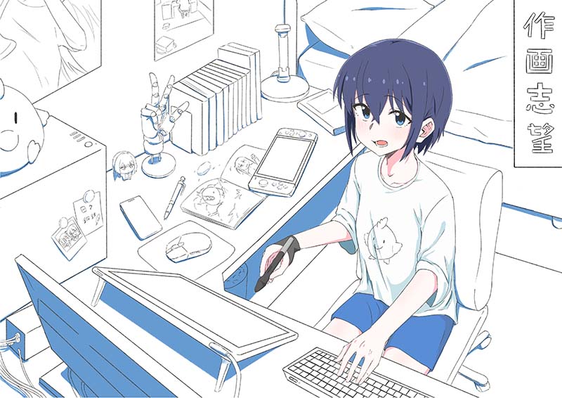 這個作品是我作品集的封面,想表達自己對於製作動畫及畫圖的熱情。因為自己喜歡畫美少女,因此想傳達自己在美少女身上所傾注的功夫。我參考了自己桌面上現有的物件,大概是花費4~5個小時完成這件作品。在製作的過程中,花費比較多時間思考整體畫面的平衡感,以及如何凸顯主角。開心的是,這件作品在應徵時有得到公司方的稱讚。
